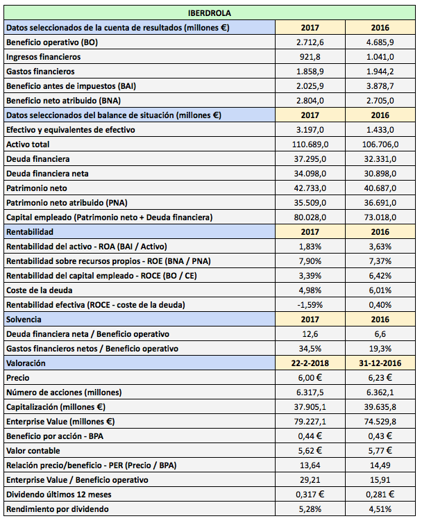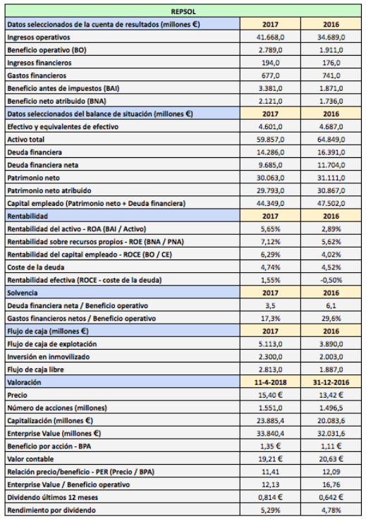 A pesar de la importante mejora, tanto cuantitativa como cualitativa, de resultados, y en sus ratios de solvencia, Repsol continúa mostrando bajos ratios de rentabilidad, aunque mejores que en 2016. La ROE (rentabilidad sobre recursos propios) fue de solo el 7,12% y la ROCE (rentabilidad del capital empleado), del 6,29%, que apenas cubre un coste de la deuda del 4,74%.