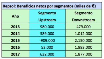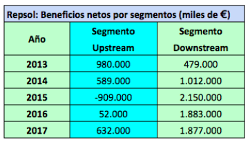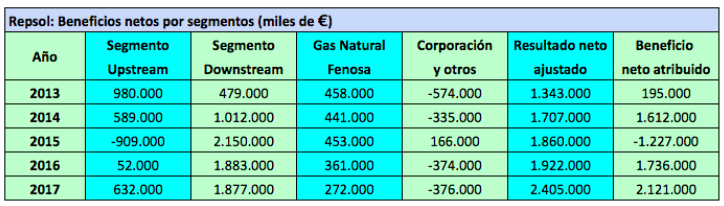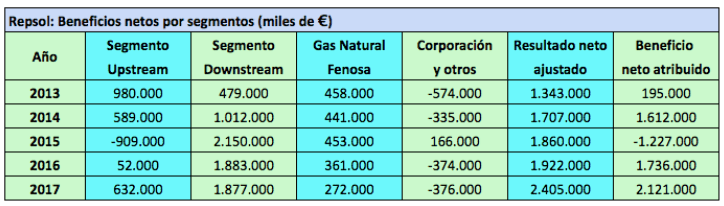 La compañía utiliza desde 2013 una medida alternativa del beneficio neto a efectos comparativos con otras empresas del sector, que denomina resultado neto ajustado. Esta magnitud se subdivide en el resultado neto del segmento de Upstream, el de Downstream, la aportación de su participación en Gas Natural Fenosa y en un cuarto epígrafe que bajo la denominación de Corporación incluye principalmente los gastos de funcionamiento y el resultado financiero (ahora incluye la participación de Gas Natural pero en la tabla he seguido el desglose anterior). El resultado neto ajustado no incluye minusvalías o plusvalías por ventas de activos, costes de reestructuración, deterioros de activos ni provisiones para riesgos.
