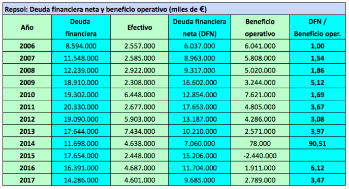 Con ese dinero decidió hacer una gran operación que le compensara de la pérdida de YPF. En diciembre de 2014 llegó a un acuerdo para adquirir el 100% de la canadiense Talisman Energy por 8.300 millones de dólares, lo que supuso asumir una deuda de 4.700 millones de dólares. Al final de 2015 Repsol había aumentado su deuda financiera en 6.000 millones de euros, lo que unido a una reducción en la liquidez de más de 2.000 millones de euros, acabó por duplicar la deuda financiera neta. La deuda de Repsol en 2017.