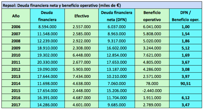 El valor contable de las acciones de Repsol es de 19,21 € en 2017. Este es el dato “oficial“. Pero dentro de los 29.793 millones de euros del patrimonio neto atribuido declarado por la compañía se incluyen 1.024 millones de euros de “otros instrumentos de patrimonio“. Se trata de una emisión de bonos subordinados garantizados emitidos en marzo de 2015 por un importe de 1.000 millones de euros. Los bonos fueron colocados entre inversores cualificados y cotizan en la bolsa de Luxemburgo. Dan un interés fijo anual del 3,875% pero no tienen fecha de vencimiento determinada. La empresa “puede diferir los pagos de cupones, sin que ello suponga una causa de incumplimiento“. Por esta razón los bonos computan como recursos propios. Además, en el epígrafe “Resultados de ejercicios anteriores y otras reservas“ hay contabilizados 29 millones de euros en concepto de gastos financieros netos de impuestos de los bonos subordinados.