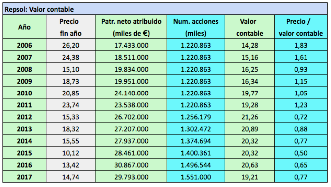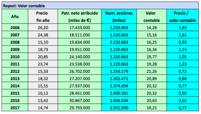 El valor contable de una acción es el patrimonio neto atribuido dividido por el número de acciones del capital social. La acción de Repsol ha cotizado por debajo de ese valor intrínseco desde 2012, y en los años precedentes lo hizo en niveles cercanos. A finales de 2015 la acción presentó un descuento récord del 50%.