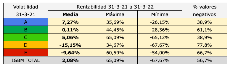Los valores más volátiles, en cambio, fueron extremadamente rentables en breves períodos de tiempo. En cuatro años, su ventaja respecto al IBEX 35 superó el 15%. Sin embargo, esto no pudo evitar que su rentabilidad media fuera negativa en un 0,14% anual a lo largo del período.