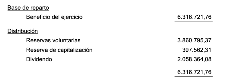 (ii) los restantes 15.011.993,44 euros se destinarán al pago de un dividendo complementario del resultado del ejercicio 2020, lo que representa 0,3974 euros brutos por cada una de las acciones con derecho a percibirlo en la fecha de la formulación de las cuentas anuales, cantidad de la que se deducirá la retención a cuenta que, en su caso, resulte aplicable.