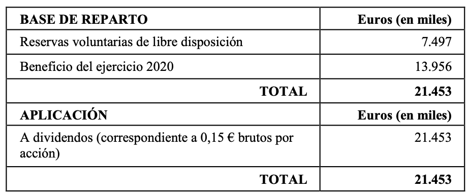 Teniendo en cuenta el dividendo a cuenta repartido el 22 de diciembre de 2020, que fue de 1,40 euros por acción, representando una cifra total de 64.904.781,20 euros, y la prima por asistencia a la Junta General de 0,01 euros por acción, la retribución total por acción que se propone alcanza un total de 1,70 euros por acción.