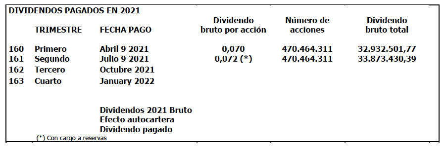 Se ratifican en este sentido los pagos del dividendo realizados el día 6 de abril y hoy, 30 de junio de 2021.