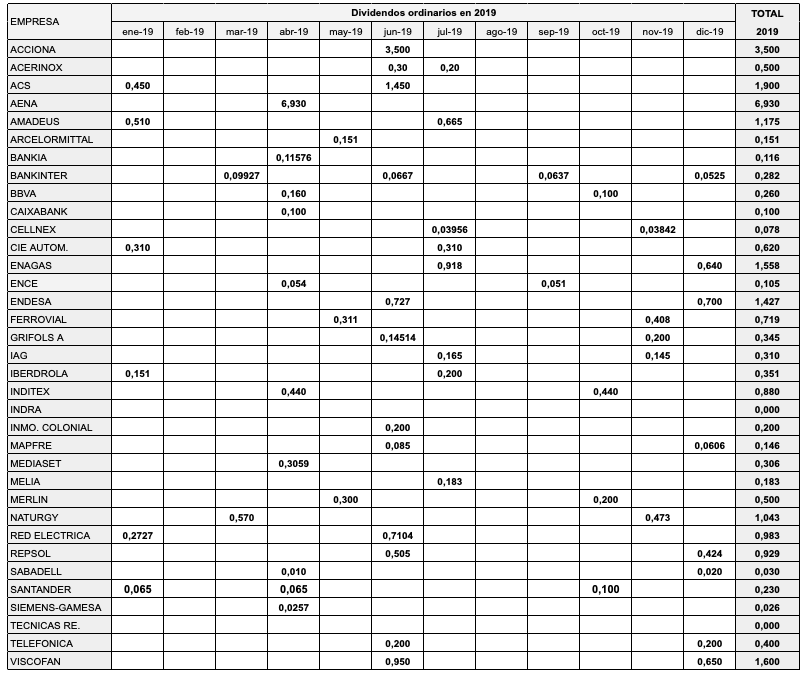 El 20 de junio de 2019 paga 0,20 € del complementario de 2018. El 19 de diciembre de 2019 pagó el dividendo a cuenta de 2019, también de 0,20 €.
