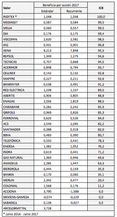 El Indice de Calidad del Beneficio (ICB) es una medida que he creado para evaluar la proporción del beneficio neto declarado por las sociedades cotizadas en el IBEX-35 que puede considerarse recurrente.