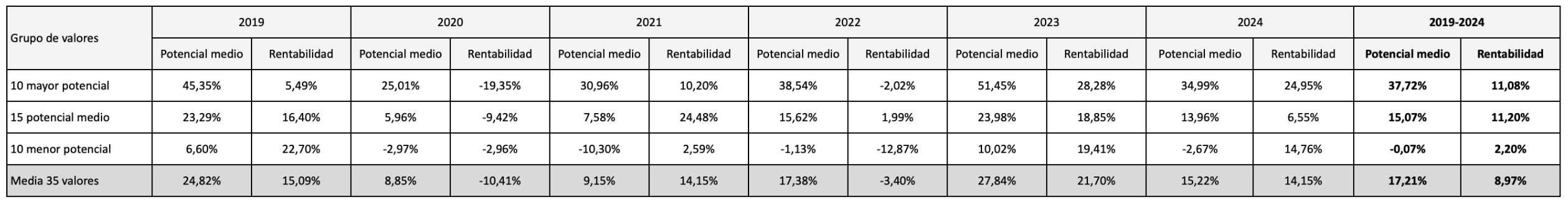 Al final de la tabla se indica el potencial medio de cada grupo (al principio del año) y la rentabilidad efectiva media de cada grupo durante el ejercicio. La última línea indica el potencial medio de los 35 valores del IBEX (al principio del año) y la rentabilidad media efectiva de dichos valores.