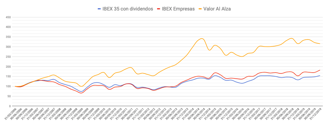 La cartera ‘Valor al alza’ estaba compuesta por los cinco valores, de entre los diez que formaban la cartera ‘Valor’, que más se habían revalorizado en los últimos nueve meses. Es decir, se trataba de escoger acciones baratas y que estaban subiendo en bolsa (o que estaban bajando menos en caso de un ciclo bajista).