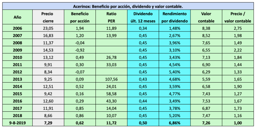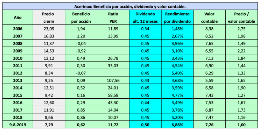La cotización de las acciones de Acerinox cayó el 9 de agosto de 2019 a 7,29 €, el mínimo desde el 7 de julio de 2013, cuando cerraron a 7,12 €. Pero mientras que en julio de 2013 cotizaron a 1,13 veces su valor contable, el 9 de agosto lo hicieron prácticamente a esa magnitud (7,26 € de acuerdo con el patrimonio neto atribuido al 30 de junio de 2019, de 1.965 millones de euros, y el número de acciones actual, que es de 270,5 millones). Esta coincidencia entre el precio de mercado y el valor contable no se daba al menos desde 2006.