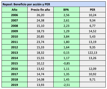 Tabla con precio, beneficio por acción y PER de la acción de Repsol de 2006 a 2019