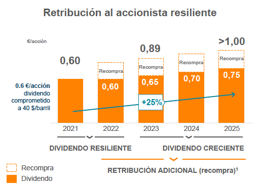 Repsol afirma que los dividendos durante el período 2023-2025 serán “crecientes“ pero partirán de un nivel de 0,60 € en 2021, mientras que la remuneración abonada en 2019 fue de 0,929 €. En 2022 prevé abonar también 0,60 € pero recomprará unos 50 millones de acciones, lo que según la compañía equivale a una remuneración adicional en tanto que dicha operación incrementará el beneficio por acción. En los ejercicios 2023 a 2025 prevé recomprar otros 50 millones de títulos anuales. Para 2025 espera abonar 0,75 € pero la remuneración total ascenderá a más de 1 € teniendo en cuenta dicha recompra.