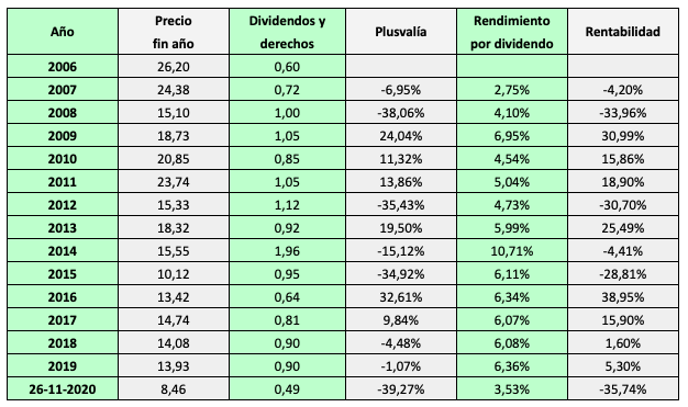 Rentabilidad de las acciones de Repsol de 2006 al 26 de noviembre de 2020