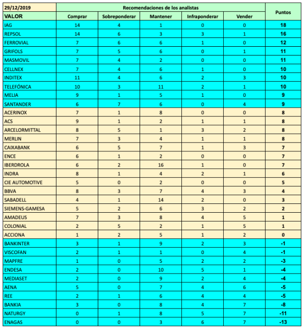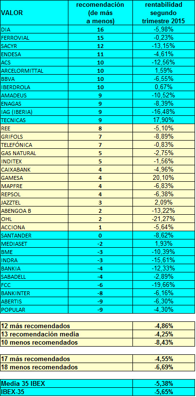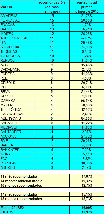 Considero, tal como suele hacerse, que la recomendación de comrpa vale 1 punto, la de sobreponderar 2 puntos, la de mantener 3 puntos, la de infraponderar 4 puntos y la de vender 5 puntos. Luego sumo las puntuaciones de los dos primeros grupos y la de los dos últimos pero no tengo en cuenta las recomendaciones de mantener. Finalmente calculo la diferencia entre ambas sumas. Cuanto mayor sea la diferencia entre ambas sumas, mayor favor recibe el valor de los analistas en general. De esta forma hago un ranking de los valores del IBEX ordenados de más a menos recomendados.