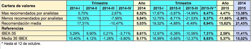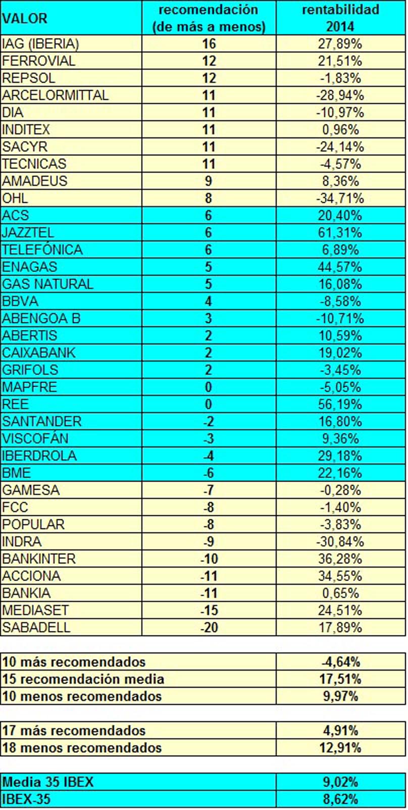 Se puede observar que los diez valores más recomendados en enero de 2014 dieron una rentabilidad media negativa del 4,64% en 2014 mientras que los diez valores menos recomendados generaron una ganancia del 9,97%. Por otro lado, el grupo de quince valores sobre los cuales los analistas fueron, en conjunto, más “neutrales” fue el más rentable, con un 17,51%. Si dividimos la tabla en dos grupos, los 17 valores más recomendados solo rindieron un 4,91%, frente al 12,91% de los menos recomendados.