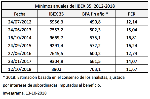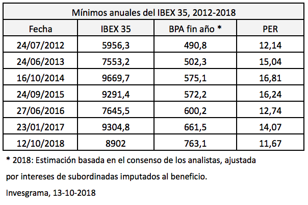 El cuadro siguiente indica los mínimos anuales del IBEX 35 desde 2012 y los beneficios por acción de cada ejercicio. Para 2018 se ha incluido el dato antes comentado de 763,05 puntos.