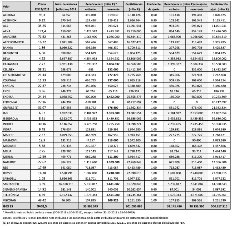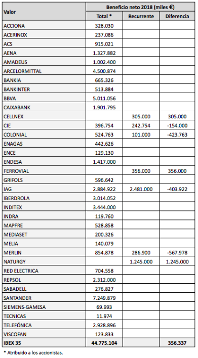Las compañías que en 2019 han publicado medidas alternativas de su beneficio para tener en cuenta elementos no recurrentes o extraordinarios son: Caixabank, Cellnex, CIE Automotive, Colonial, Endesa, Grifols, IAG, MásMóvil, Merlin, Naturgy, Repsol, Santander, Telefónica y VIscofán. Ferrovial ofrece una medida alternativa en sus cuentas anuales pero no en las trimestrales.