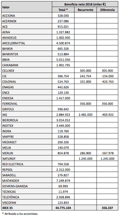 Beneficios recurrentes de las empresas del IBEX que tuvieron pérdidas en 2018