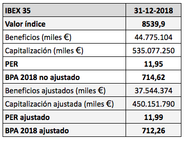 Así, la capitalización ajustada total al cierre de 2018 fue de 450.151 millones de euros y el conjunto de beneficios netos ajustados por el mismo procedimiento, de 37.544 millones de euros. Al dividir ambas cantidades, obtenemos el PER ajustado del IBEX 35, que fue de 11,99, lo que nos da un beneficio por acción en 2018 de 712,26 puntos.