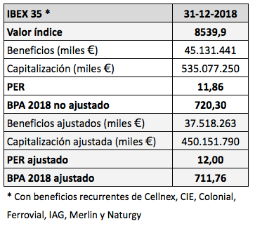 El ratio PER y el beneficio por acción del IBEX 35 con los resultados de 2018