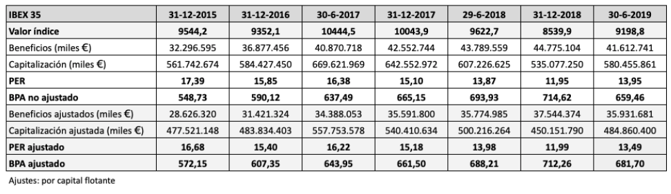 Ver PER del IBEX tras los resultados del primer semestre de 2019 para ver el procedimiento de cálculo de los beneficios totales.