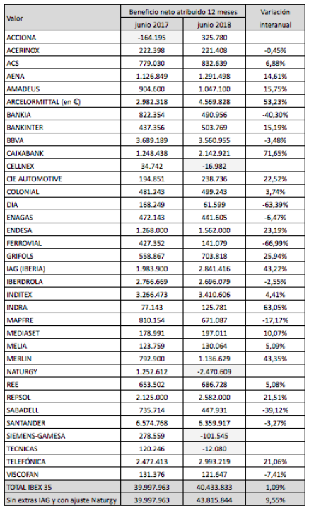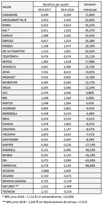 La tabla siguiente recoge la variación entre el beneficio de doce meses acumulado a marzo de 2022 respecto del beneficio de doce meses acumulado a marzo de 2021, para 24 de las 35 compañías del IBEX 35. No se ha considerado Acciona, Ferrovial y Grifols porque publican resultados semestrales, ni aquellas empresas que han tenido pérdidas en uno u otro período.