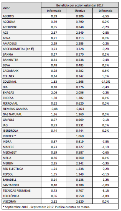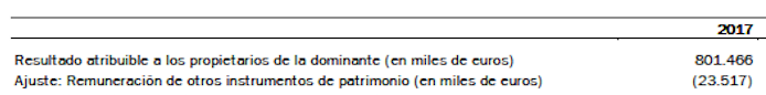 Con objeto de cubrir las ampliaciones liberadas para el pago del Dividendo Flexible en acciones, el capital social de Acerinox ha aumentado un 10,7%, de los 249,3 millones de acciones de 2012 a los 276,1 millones actuales, lo cual provoca un efecto dilución en el beneficio por acción. En 2017, el beneficio neto atribuido fue de 234,1 millones de euros, 0,848 € por acción. Sin las ampliaciones, el beneficio por acción habría sido de 0,939 €, un 10,7% más elevado. El precio de la acción seguramente también estaría alrededor de un 10% por encima del nivel actual.