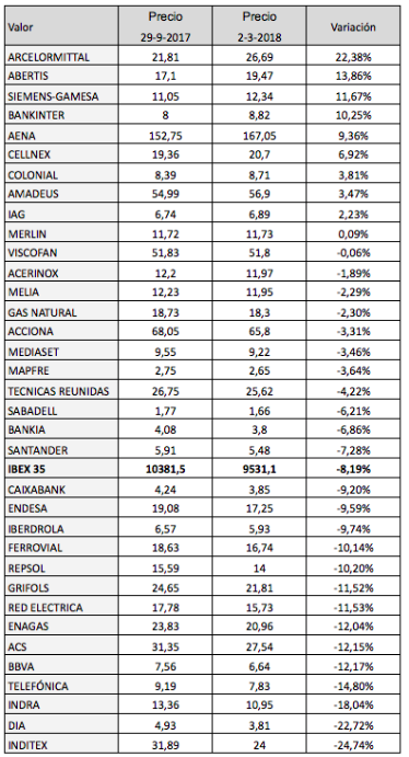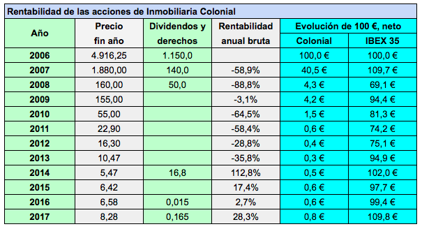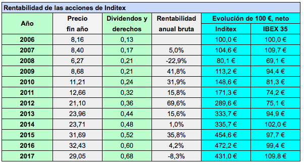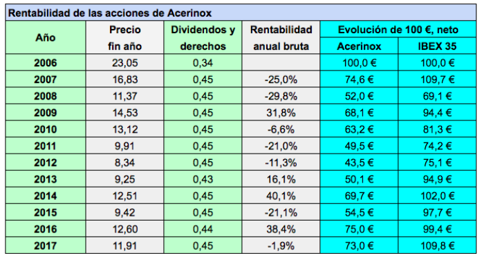 Desde finales de 2006, cien euros invertidos en títulos de Acerinox se habrían convertido en 73 € al final de 2017 mientras que habrían aumentado a 109,8 € en el IBEX 35 con dividendos netos.