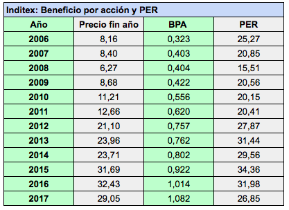 Esta buena situación financiera no debe hacernos olvidar la baja estabilidad y la escasa predicibilidad de los resultados de la compañía, así como la elevada dependencia respecto al precio de las materias primas. Teniendo en cuenta esto, a los precios actuales (11,30 €) el PER de las acciones está alto a 13,3. En la segunda tabla se puede ver que el ratio PER al final de 2006 era de un moderado 11,9 y a pesar de ello las acciones habían caído un 70% seis años y medio después. Ahora se puede argumentar que entonces estábamos en la parte alta del ciclo, pero eso nadie lo sabía entonces. La relación precio / valor contable, de 1,73, también es elevada por los mismos motivos.
