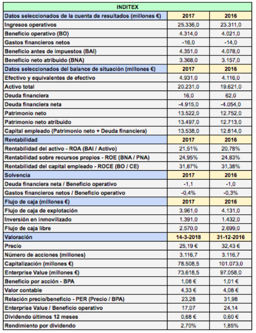 Los resultados de 2017 sitúan a la empresa en una buena posición financiera para aprovechar la recuperación económica. La rentabilidad sobre el capital empleado fue del 9,84%, totalmente adecuada dada la calidad del beneficio y un coste de la deuda del 3%. La solvencia es igualmente correcta. Los gastos financieros fueron menos del 10% del beneficio operativo. Como señala la propia compañía, los gastos financieros netos han pasado de 66 millones de euros en 2012 a solo 19 millones en 2017.