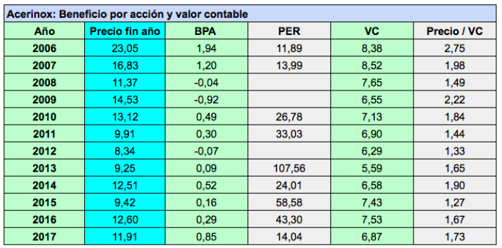 Acerinox tuvo pérdidas en 2008, 2009 y 2012. Además, entre 2008 y 2016 ha pagado en algunos años en concepto de dividendos una cantidad superior a la obtenida como beneficio, de modo que ha tenido que recurrir a las reservas para remunerar a los accionistas. Las pérdidas y el pago de dividendos han descapitalizado a la compañía, cuyo patrimonio neto atribuido a los accionistas era de 2.174 millones de euros en 2006 frente a los 1.897 millones de euros de 2017. El valor contable por acción se ha reducido un 18% desde 2006, de los 8,38 € a los 6,87 € actuales, si bien hay qye tener en cuenta que la reducción del patrimonio neto atribuido en 2017 también tiene que ver con la caída del dólar, que ha supuesto una depreciación en euros del patrimonio neto de sus participadas estadounidenses.
