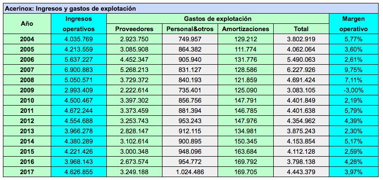 La tabla siguiente recoge la evolución de los ingresos operativos y de los costes de explotación, incluyendo amortizaciones, de la empresa entre 2004 y 2017. Se observa que el margen operativo fue de solo el 4% en 2017. Este porcentaje está en línea con el registrado en otros años y explica la facilidad con la que Acerinox entra en, o se acerca a, pérdidas. Por otro lado, vemos que los gastos de personal y otros gastos de explotación han aumentado un 36% desde 2004 mientras que los ingresos lo han hecho solo un 15%. Es un aspecto que la empresa tiene presente, pues tiene en marcha Planes de Excelencia, herramientas de gestión para mejorar la eficiencia de costes.