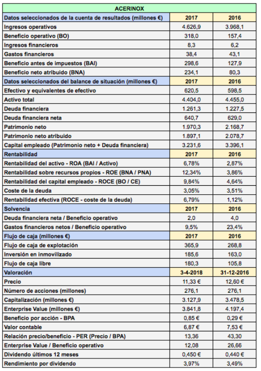 Acerinox debería incrementar resultados un 30% en 2018 y mejorar márgenes para justificar tales valoraciones. Imagino que es lo que espera el mercado, una expectativa que entra dentro de lo posible al ser una compañía “apalancada en el ciclo económico“, es decir, cuyos beneficios pueden aumentar significativamente más que el crecimiento general de la economía. Acerinox depende en buena medida de la demanda de acero inoxidable procedente de la construcción, los automóviles y los electrodomésticos, sectores en recuperación.
