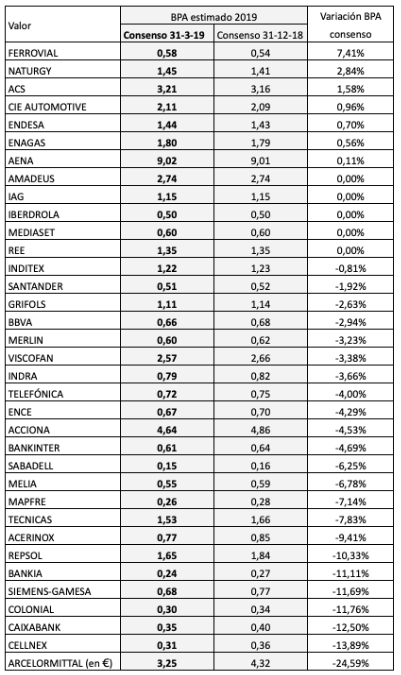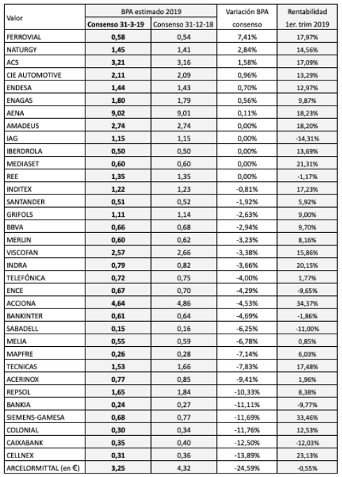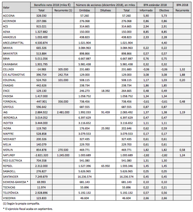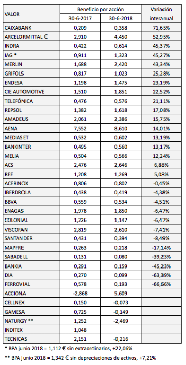 La tabla siguiente ordena los valores del IBEX 35 según la variación de su beneficio por acción entre los períodos considerados. Solaria todavía no ha publicado sus resultados semestrales.