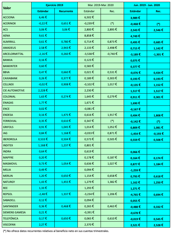 Para comparar la evolución de los beneficios actuales con los niveles anteriores al confinamiento provocado por la pandemia de la Covid-19, he utilizado los resultados de doce meses de julio de 2020 a junio de 2021 y los resultados de 2019. En los casos en los que la empresa informa de una medida alternativa del beneficio que refleja mejor la evolución de sus resultados que la definición estándar, se ha seguido dicho criterio alternativo.