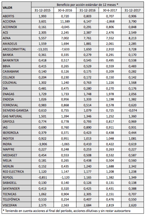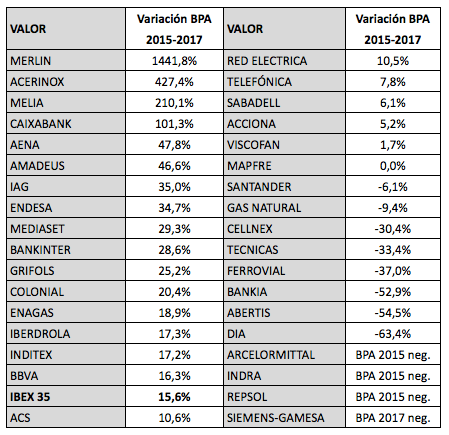 La tabla siguiente recoge el beneficio por acción interanual a marzo de 2018 (abril de 2018 para Inditex) de los valores del IBEX 35 y el incremento respecto al de marzo de 2017. Las dos sociedades que más progresaron fueron las inmobiliarias Colonial y Merlín Properties, aunque buena parte de sus beneficios son revalorizaciones de activos.