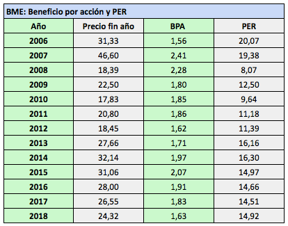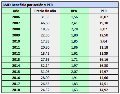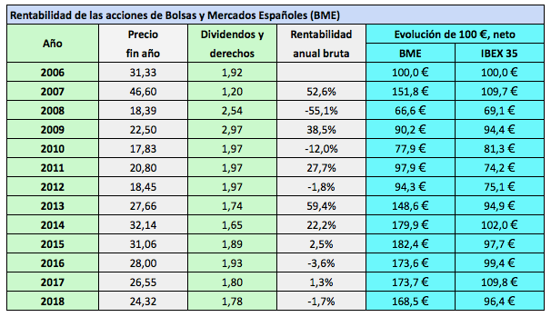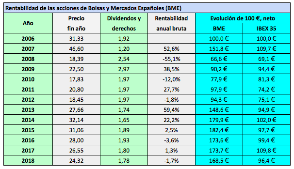 A pesar de la minusvalía en el precio del 22% entre 2006 y 2018, las acciones de BME han dado una rentabilidad acumulada neta del 68,5% en este período, mientras que el IBEX 35 con dividendos netos ha perdido un 3,6%. Esto se debe a la reinversión de los dividendos. Ver Reinversión de dividendos: cómo doblar el capital con unas acciones que no suben