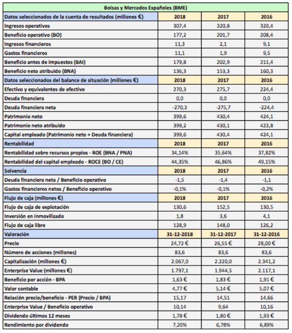 En la tabla siguiente se observa una caída del precio de los 31,06 € de finales de 2015 a los 24,32 € de finales de 2018. Sin embargo, el ratio PER (precio dividido por el beneficio por acción) ha estado en torno a 14,5 – 15 veces al cierre de cada año de este período.