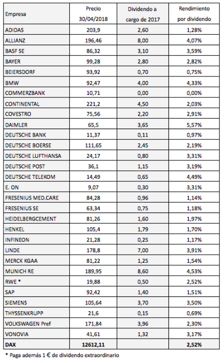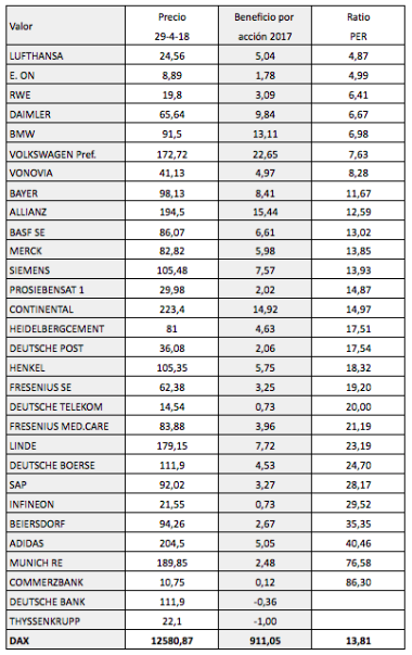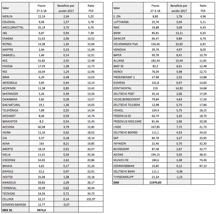 Los datos indicados en el cuadro corresponden al cierre del viernes 11 de diciembre. Ese día, el IBEX-35 cerró a 9.630,7 puntos y el DAX a 10.340,06 puntos.