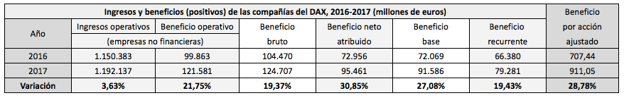 Considero que la verdadera fuerza motriz de la bolsa son los beneficios recurrentes de las empresas no financieras. Por este motivo, calculo una tercera medida del PER, el PER recurrente, que descarta otros beneficios atípicos. La comparación es complicada porque, que yo sepa, las sociedades cotizadas alemanas no siguen un modelo estandarizado en su cuenta de resultados como las españolas.