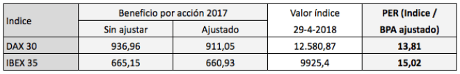 Con el fin de calcular la valoración relativa, es decir, qué índice está más caro en relación al otro, utilizaré tres medidas del ratio PER (relación precio-beneficio). Tengo en cuenta los ajustes por capital flotante tanto en el DAX como en el IBEX. Estos ajustes los determinan los respectivos responsables de elaborar los índices y se usan para que el índice sea más representativo de las acciones que efectivamente circulan libremente en bolsa.