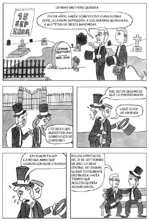 La quiebra de Lehman fue en realidad un punto de inflexión. Las tres grandes sociedades hipotecarias de Estados Unidos, New Century, Ameriquest y Countrywide, quebraron en serie entre abril de 2007 y enero de 2008, pero las dos últimas (las dos mayores) fueron adquiridas, y por tanto, rescatadas, por Citigroup y Bank of America. Cuando quebró Bear Stearns, el quinto mayor banco de inversión, este fue adquirido por JP Morgan.