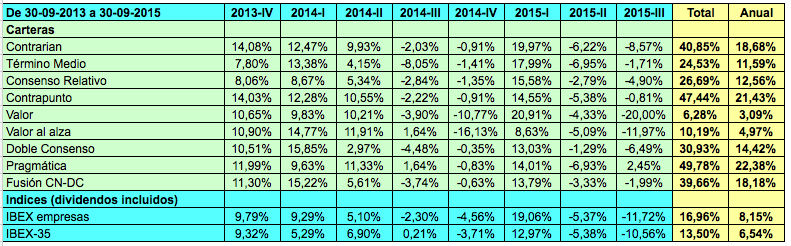 Los datos de la penúltima columna señalan la rentabilidad acumulada entre el 30 de septiembre de 2013 y el 30 de septiembre de 2015. La última columna es la rentabilidad anualizada en este período.