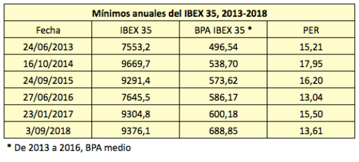 El valor más bajo del PER alcanzado desde la recuperación iniciada en julio de 2012 (5.956,3 puntos) se dio el 27 de junio de 2016 tras el resultado de la votación a favor de la salida del Reino Unido de la Unión Europea. Dicho valor fue de 13,36 veces los beneficios de 2015 y de 13,04 veces si se tiene en cuenta el beneficio por acción medio del índice en los años 2015 y 2016. El IBEX alcanzaría una valoración tan baja como entonces si cayera a 8.982 puntos (13,04 x 688,85).