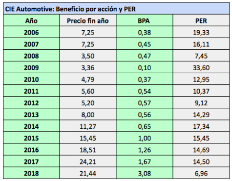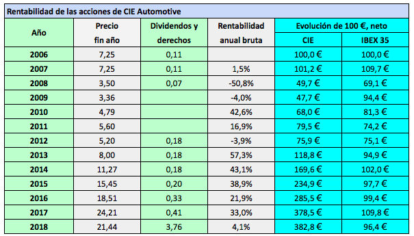 Las acciones de CIE Automotive han sido unas de las más rentables de la bolsa española. CIen euros invertidos en estos títulos en diciembre de 2006 se habrían convertido en 382,8 € en 2018 si se hubieran reinvertido los dividendos netos.
