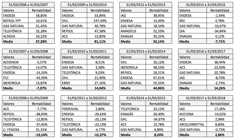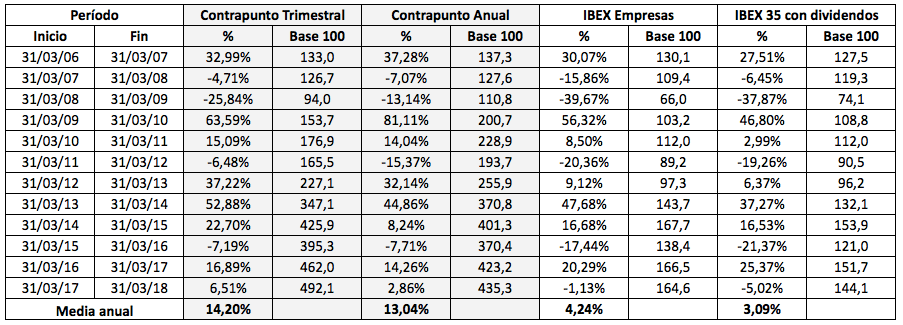 La tabla siguiente recoge la composición y rentabilidad de la Contrapunto con actualizaciones anuales cada 31 de marzo. Vemos que de los 60 valores seleccionados entre marzo de 2006 y marzo de 2017, ha habido seis que han perdido un 30% o más en el año: FCC (-43,39%), Repsol (-38,94%), Endesa (-37,45%), de nuevo Endesa (-29,63%), OHL (-34,97%), y DIA (-34,84%). En el caso de FCC, OHL y DIA las pérdidas se acentuaron en los meses o años siguientes.