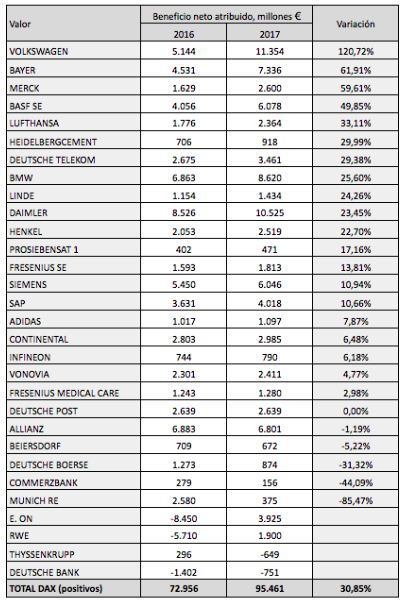 En 2017, las 30 compañías que forman el principal índice de la bolsa alemana, el DAX 30, ganaron un 30,85% más que en 2016, teniendo en cuenta únicamente los resultados positivos. Si consideramos también los negativos, el incremento fue del 63,89% debido a las fuertes pérdidas registradas en 2016 por las compañías energéticas E.On y RWE.