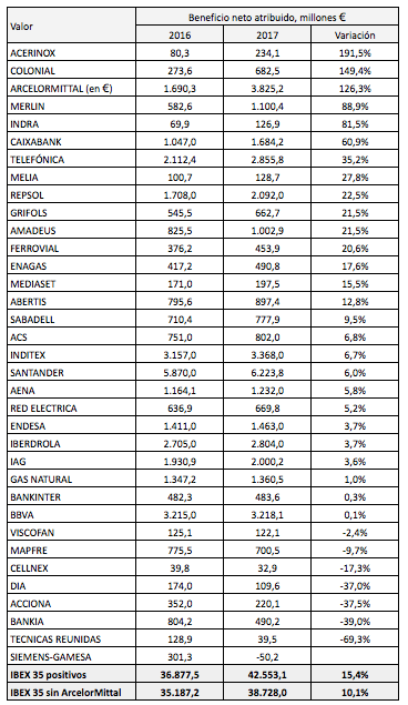 La cifra agregada del beneficio neto atribuido positivo de las compañías del DAX fue de 95.461 millones de euros en 2017. Representa 2,5 veces la cifra agregada del IBEX 35, que fue de 38.728 millones de euros sin ArcelorMittal (compañía que está domiciliada en Luxemburgo). En el caso del índice español, los resultados crecieron un 10,1% respecto a 2016 sin ArcelorMittal y del 15,4% con la siderúrgica.
