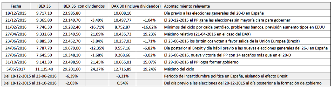 En el cuadro siguiente comparo la evolución del IBEX 35 con la del DAX alemán en el período de incertidumbre política que ya atravesó el país desde las elecciones del 20 de diciembre de 2015 hasta la formación de gobierno el 29 de octubre de 2016 para intentar valorar el impacto de la inestabilidad en la bolsa española.