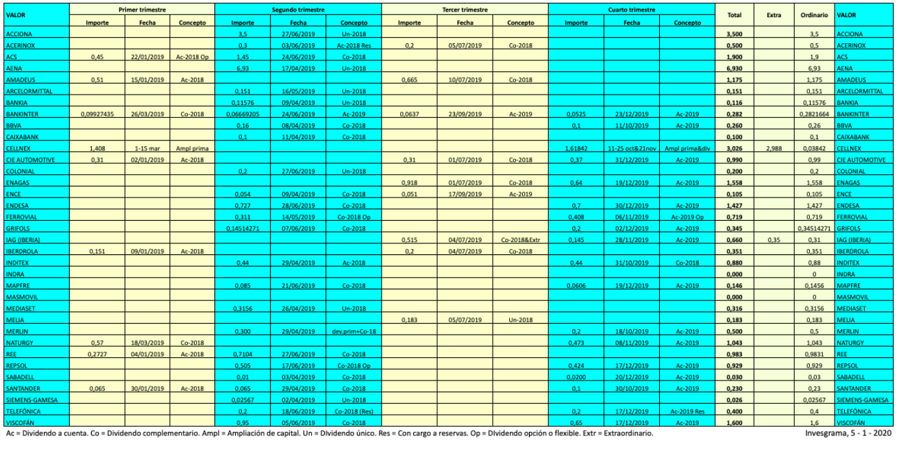 No todos estos dividendos fueron efectivamente pagados en 2019: el de Endesa descontado el 30 de diciembre fue abonado el 2 de enero de 2020 y el de CIE Automotive descontado el 31 de diciembre fue pagado el 3 de enero de 2020.
